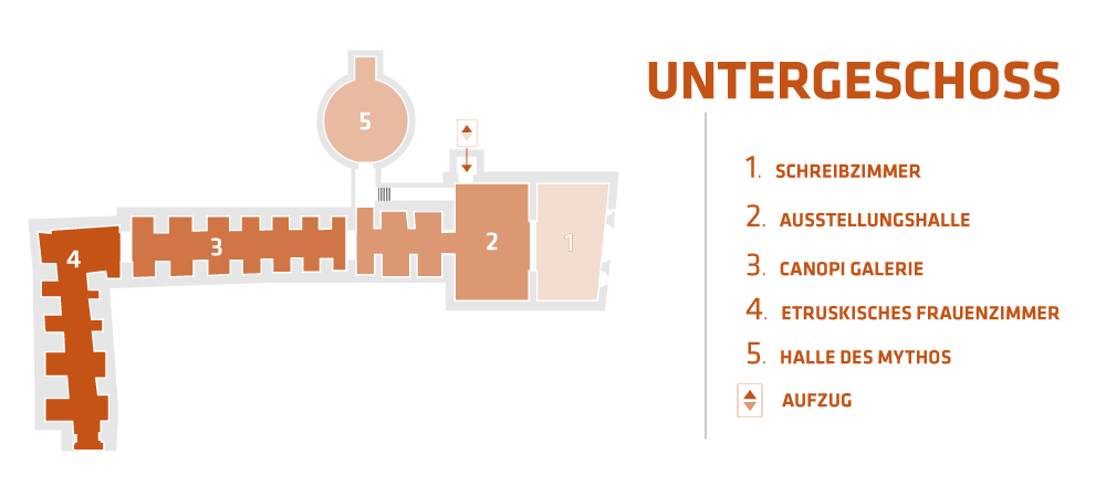 Die Ausstellung in diesem Stockwerk wird durch die anschauliche Schilderung der etruskischen Sprache vervollstӓndigt, die sowohl mit Hilfe von Reproduktionen und Videos als auch mit den beschrifteten Objekten, die in den Grӓbern gefunden worden sind, veranschaulicht wird.