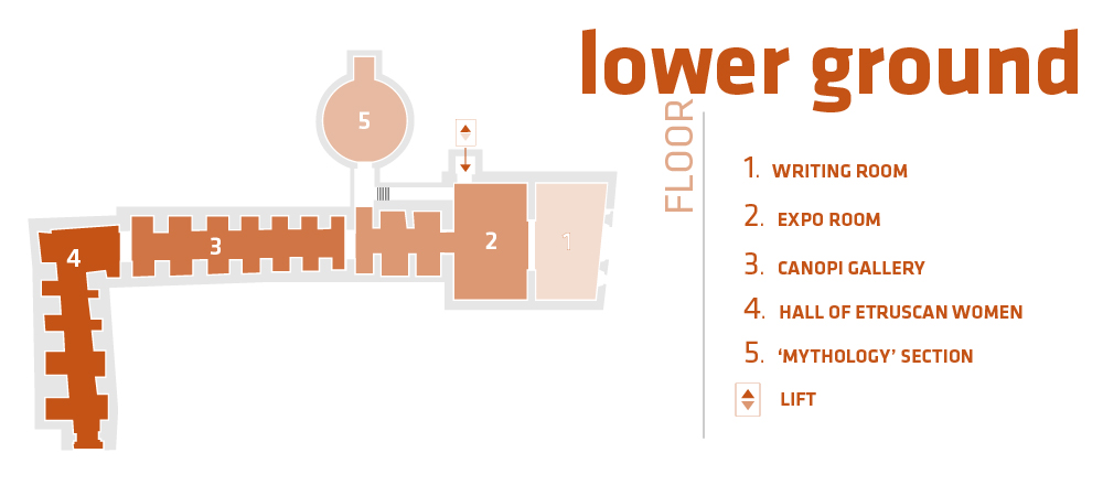 This floor is completed by the section covering the Etruscan language, which is explored through videos and informative reproductions together with objects that were recovered during the excavations of tombs, testifying to the elevated cultural standing held by the Etruscan aristocrats in the territory.