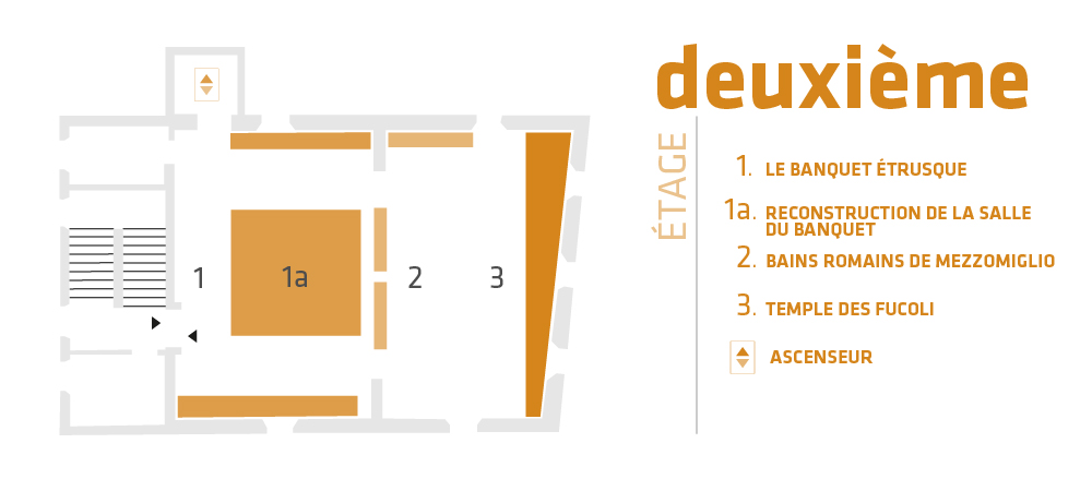 Le dernier étage du musée abrite la section suggestive sur le symposium étrusque ; ici, le visiteur est virtuellement invité à visiter la demeure d'un prince étrusque nommé « Aranth » ; il est donc possible de voir la reconstitution grandeur nature de la salle de banquet avec les lits de table (triclinia) où les Étrusques prenaient leurs repas avec leurs épouses, ce qui représentait un grand scandale pour les mœurs de l'époque ; dans la salle sont également exposés divers objets rituels et d'usage courant liés à la consommation d'aliments, en particulier la viande et le vin, une boisson alors associée au contact con le divin. Dans l'autre salle sont exposés les vestiges provenant des fouilles d'un complexe thermal de l'époque augustéenne, où le poète Horace venait se soigner avec les eaux de Chianciano. On y trouve également quelques vitrines contenant des objets donnés au Musée par les Citoyens ; toujours dans cette salle, une balustrade offre un point de vue particulier sur le fronton du temple des Fucoli situé à l'étage inférieur.