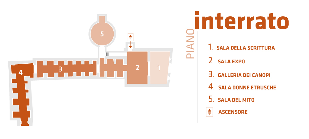 Si prosegue poi verso le vecchie cantine dell’edificio; qui l’effetto scenografiche della galleria scavata nella sabbia della collina si sposa perfettamente con le ricostruzioni delle tombe di VII sec. a.C. rinvenute nella necropoli della Foce – Tolle. Suggestive le ricostruzioni delle camere sepolcrali nelle varie tipologie: a ziro, a camera, a cassone ecc. con i misteriosi cinerari a forma umana detti “canopi”.