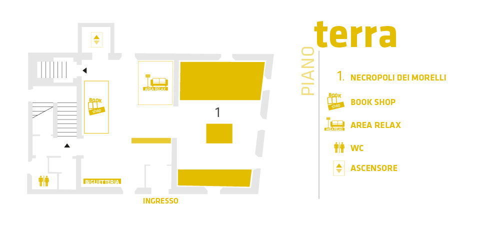 Il piano terra ospita la suggestiva ricostruzione a grandezza naturale della camera sepolcrale di una delle tombe più ricche rinvenute nel territorio di Chianciano Terme; si tratta sicuramente di una tomba principesca, databile al VII sec. a.C. rinvenuta nelle vicinanze della cittadina, lungo un importante asse viario che, attraverso le valli dell’Orcia e dell’Ombrone, conduceva verso le importanti città costiere etrusche di Vetulonia e Populonia. Il corredo rinvenuto indica in modo chiaro lo status del defunto: un aristocratico che nel momento del trapasso nell’aldilà, si è voluto circondare di oggetti simbolo come il necessario per il simposio: un rarissimo tavolo in lamina di bronzo con piano e gambe lavorate a sbalzo e tutto il corredo del simposio come vasi e alari per il fuoco. Notevole l’ossuario globulare in bronzo, in origine con testa in legno, di cui si conserva solo la lamina d’oro e gli occhi in osso e ambra della maschera. Splendido lo scudo in bronzo decorato a sbalzo con motivi geometrici vegetali e zoomorfi. Nella stessa stanza è esposta un’altra interessante tomba di 2 secoli più recente a sepoltura multipla, dove è possibile ammirare i cinerari a forma di casa in pietra fetida dove venivano riposte le ceneri del defunto, decorate e colorate con vivaci colori a testimoniare la ricchezza cromatica del mondo antico.